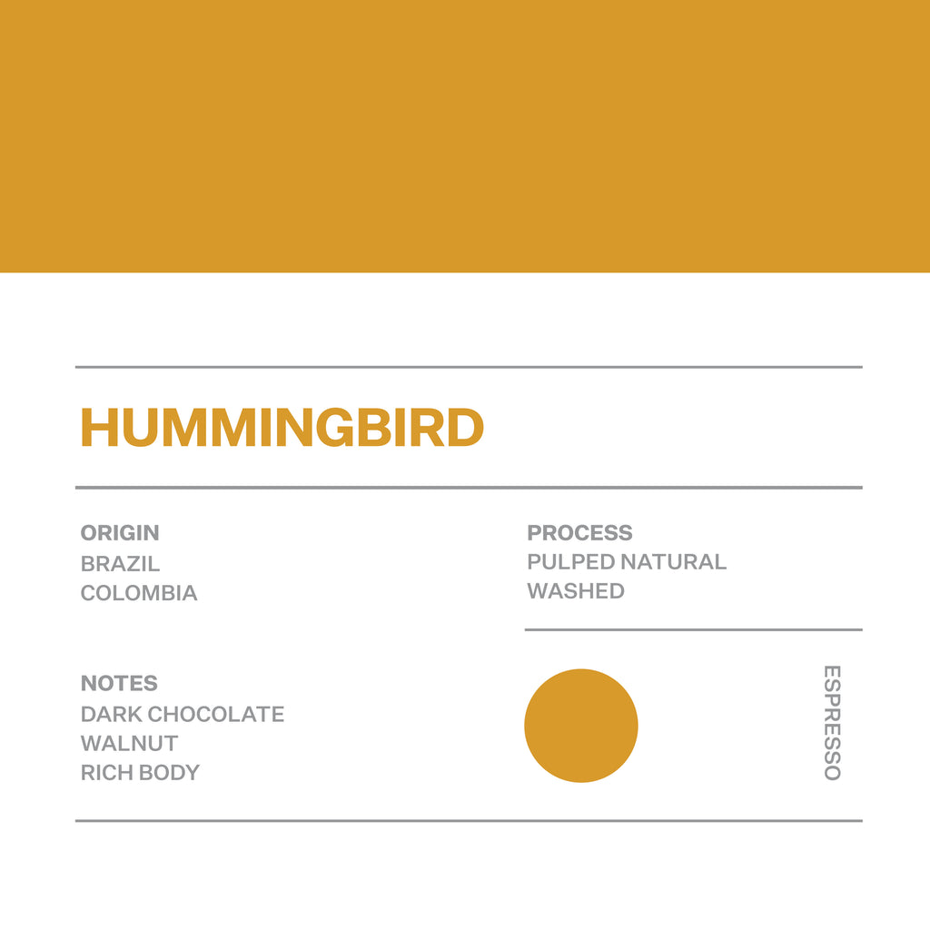 Hums like a bird and stings like a bee! Hummingbird espresso blend is big and bold with low acidity, designed specifically to cut through milk. Made up of seasonally available Colombian and Brazilian coffees, expect dark chocolate and walnuts accompanied with a rich body. This coffee is to satisfy those who like their coffee with a punch!